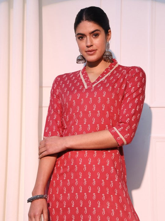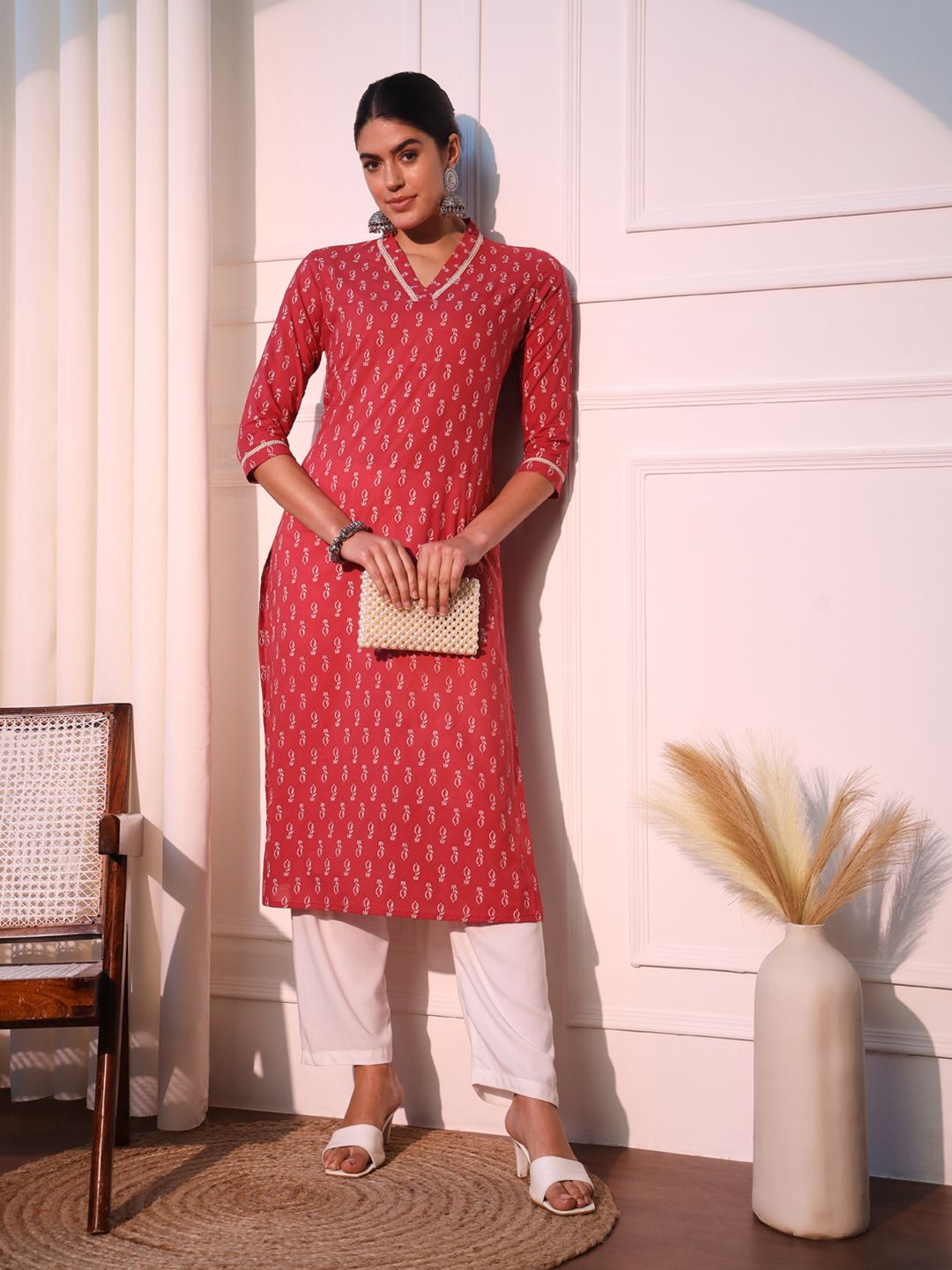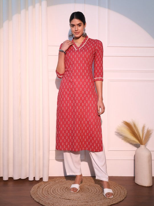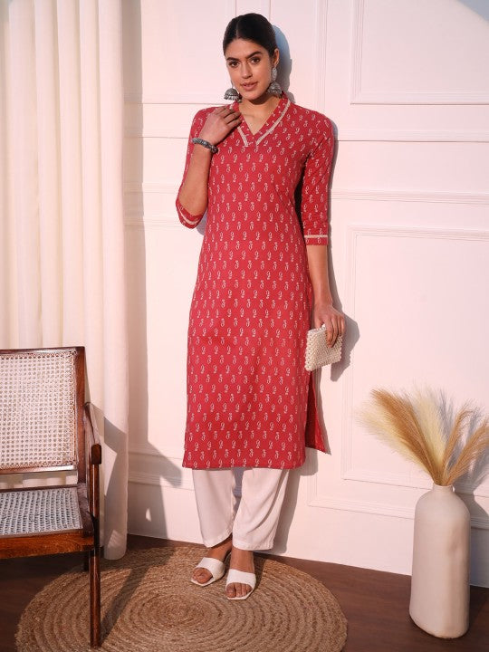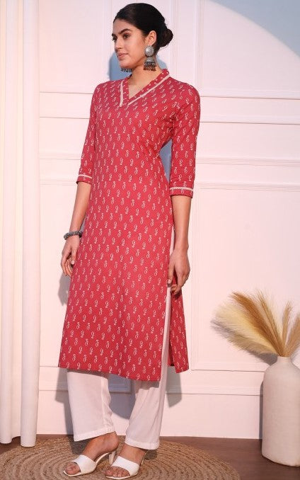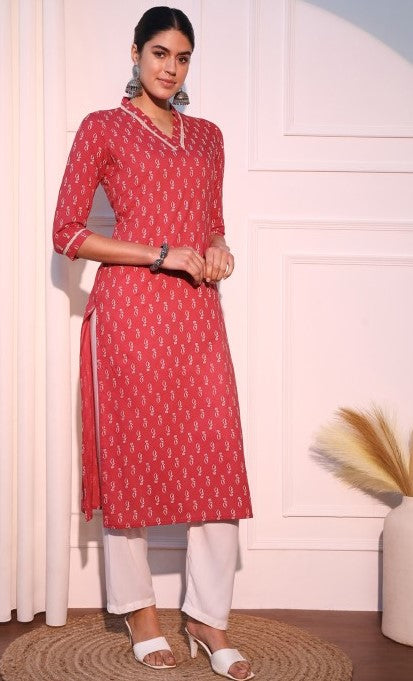 Add a touch of elegance to your ethnic wardrobe with this Dark Peach Printed Long Kurta, designed for both comfort and style. Crafted from a lightweight and breathable fabric, this kurta features an intricate white print that enhances its traditional charm. The V-neckline and three-quarter sleeves are adorned with delicate detailing, adding to its graceful appeal. With its straight-cut silhouette and side slits, this kurta offers a flattering fit, making it a perfect choice for casual outings, office wear, or festive occasions.